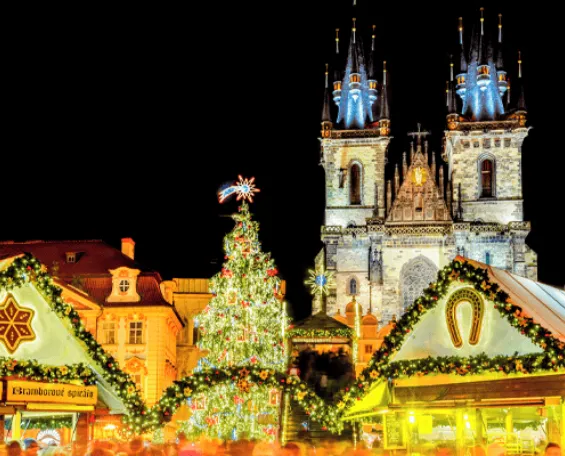 Flights from UK to magical Prague, perfect for strolling cobbled streets, enjoying mulled wine, and exploring traditional European Christmas markets with a festive vibe.
