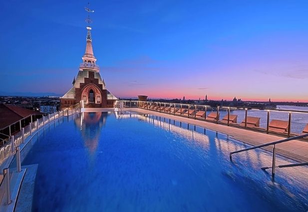 Hilton Molino Stucky Venice, a restored flour mill on Giudecca Island, blends industrial heritage with modern luxury. Spacious rooms and lagoon-view suites offer romance and comfort. Couples can enjoy the rooftop pool, spa treatments, and fine dining while watching the sunset over Venice. Its peaceful island setting allows intimate moments away from crowds, yet easy shuttle access keeps iconic sites close. Perfect for honeymooners seeking a mix of luxury, history, and Venetian charm.