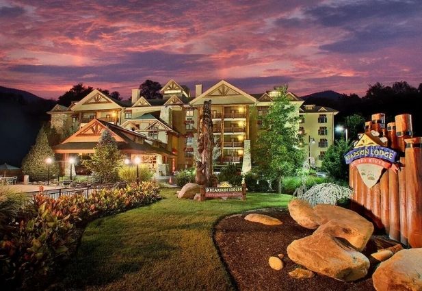Set at the edge of the Great Smoky Mountains, this lodge features rustic warmth with modern amenities. Rooms offer river-view balconies, fireplaces, hardwood floors, and Keurig coffee makers. Guests can relax in the outdoor pool, float along the lazy river, enjoy daily breakfast, or gather around the fire pits. Its natural setting and cozy atmosphere make it a top road-trip retreat.