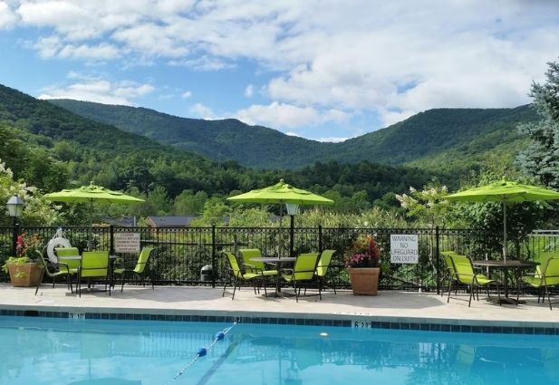 A lodge-style hotel surrounded by mountain scenery near the Blue Ridge Parkway. The property includes walking trails, EV charging, a heated outdoor pool, and a 24/7 fitness center. Rooms come with refrigerators, microwaves, and Keurig machines. With an on-site restaurant featuring locally sourced dishes, it provides a peaceful and convenient home base for exploring Asheville and the mountain region.